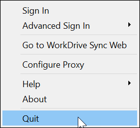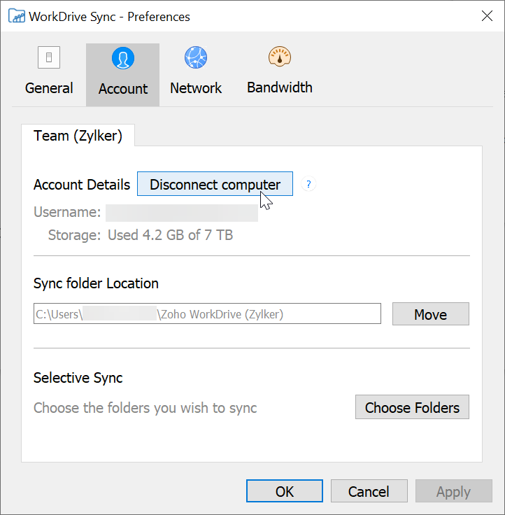 当您不再希望 Zoho WorkDrive 帐户与计算机同步时,您可以断开该计算机的连接。当您断开计算机连接时,已与该计算机同步的文件将不会被删除,只有该计算机与 Zoho WorkDrive 之间的同步被停止。所有文件都将在 WorkDrive Web 上可用。
