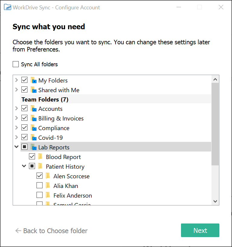 默认选项是同步 Zoho WorkDrive 帐户中的所有文件夹(即我的文件夹与我共享团队文件夹)。您也可以选择从帐户中选择性同步某些文件夹及其子文件夹。选择所需的文件夹,然后单击下一步