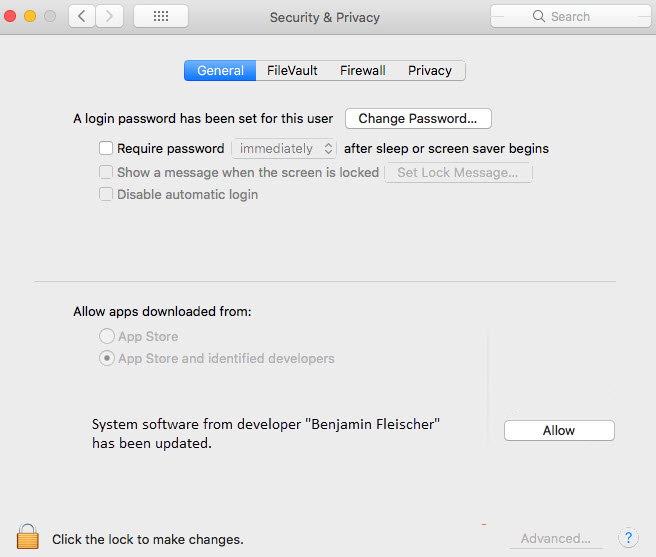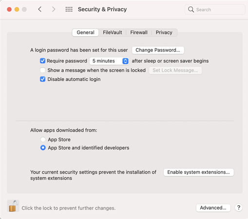 - 在安全和隐私菜单中,单击左下角的锁定图标,然后输入密码以解锁。