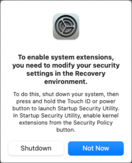 在使用 M1 或 M2 芯片的 Apple 设备中安装 WorkDrive TrueSync 应用时,您可能会看到 Apple 弹出“系统扩展程序被阻止”窗口。必须允许系统扩展程序才能使用 WorkDrive TrueSync。