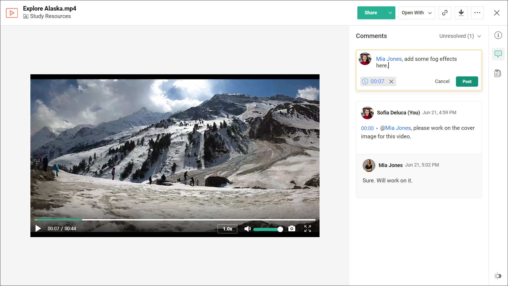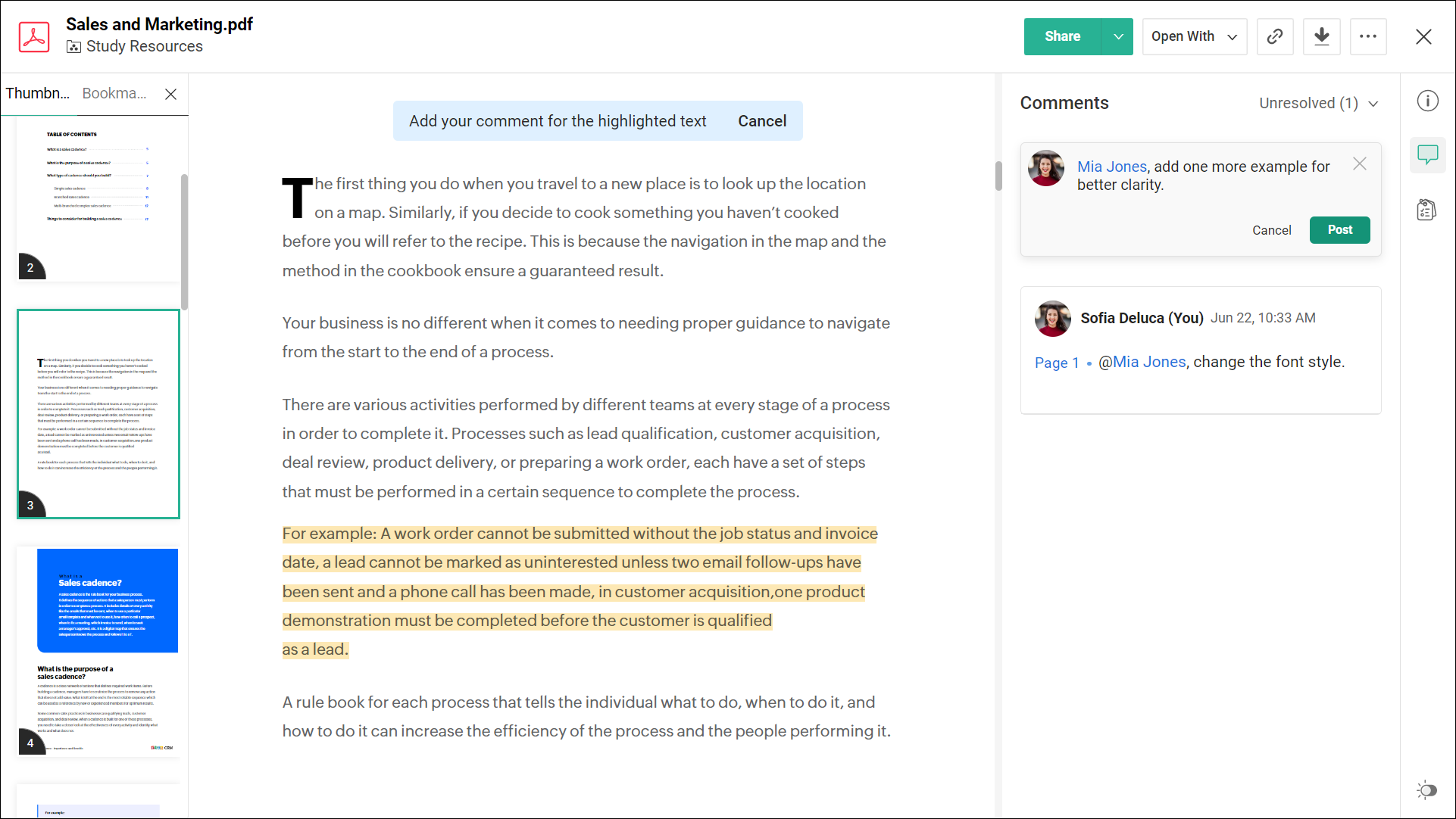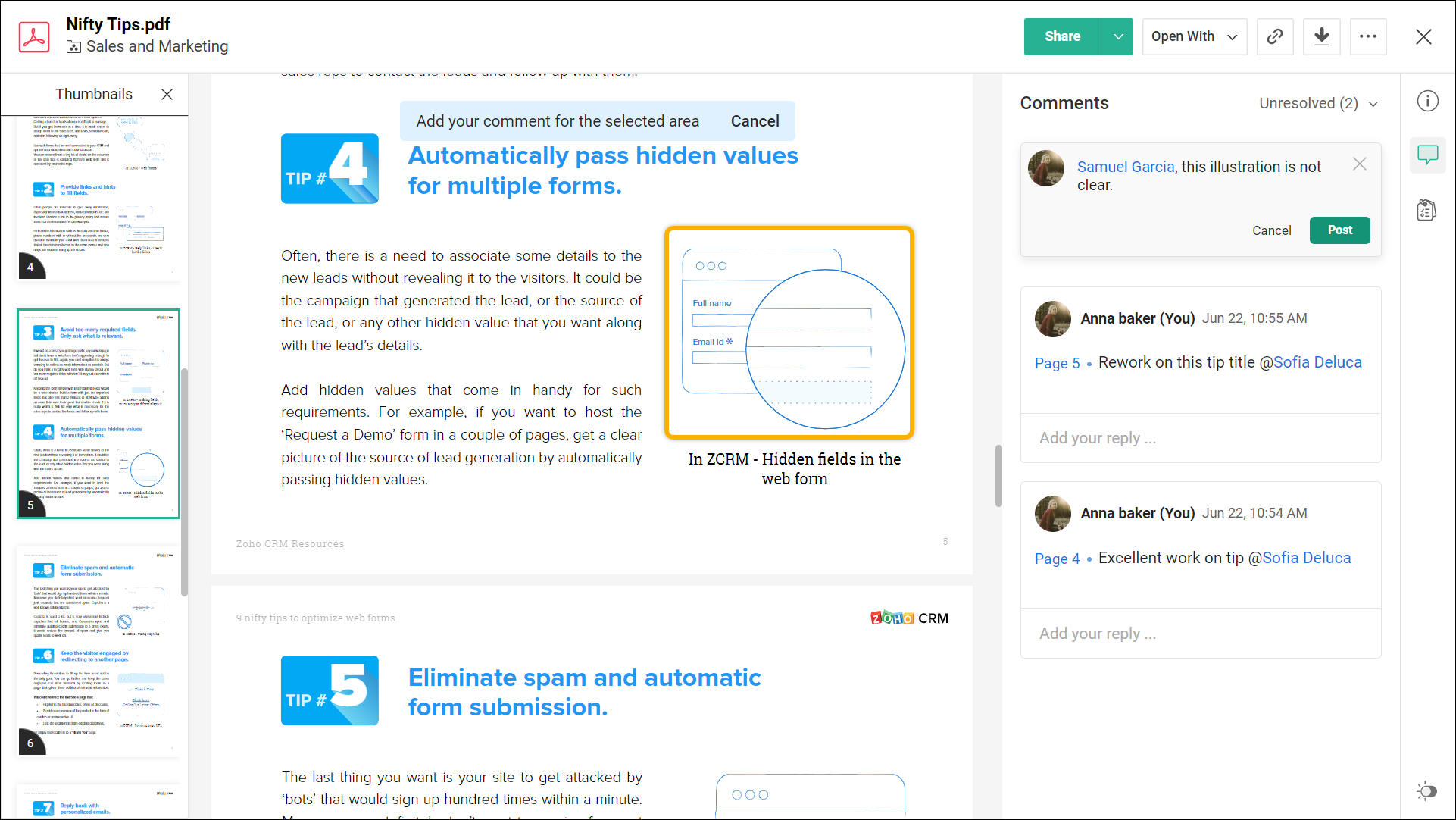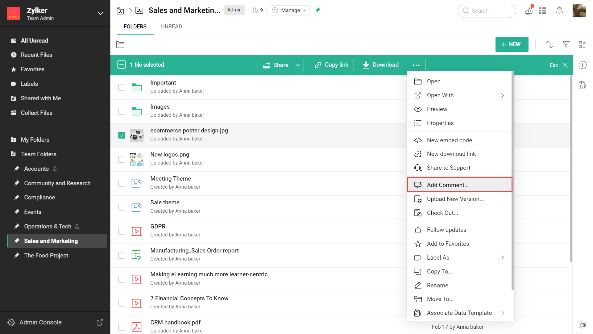 Zoho WorkDrive 允许审阅者使用评论功能针对共享文件提供反馈意见和交流想法。