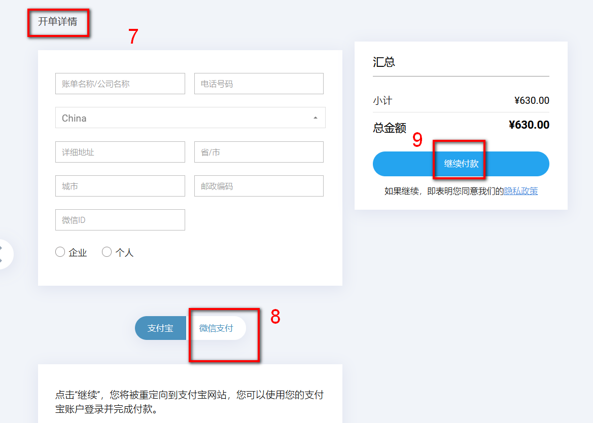 7. 查看订单总金额。如需发票,请填写左侧的开单详情。