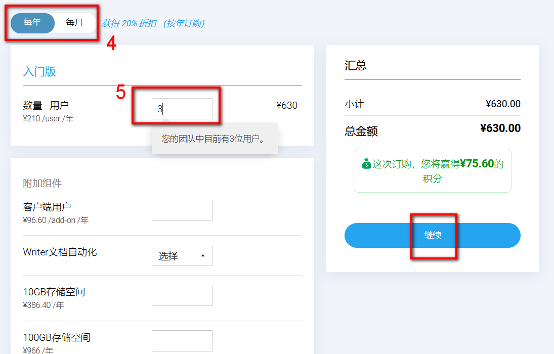4. 选择订购类型:年付或月付。