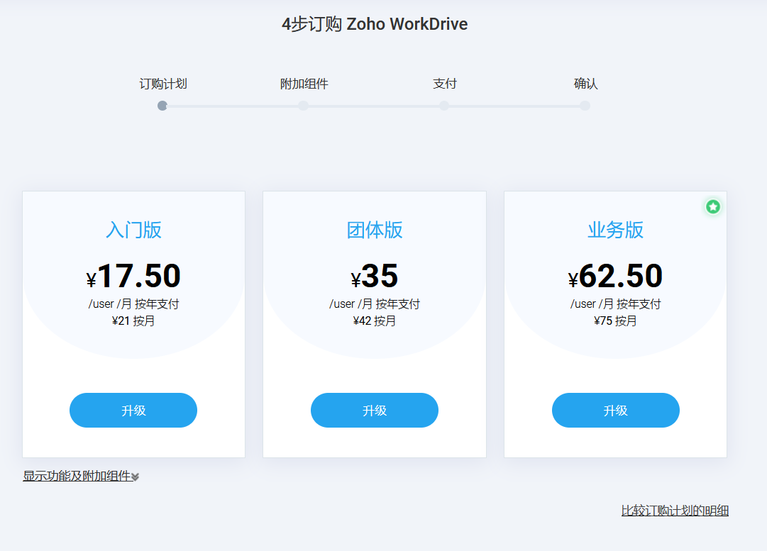 可用版本包括:入门版、团队版和业务版。您可以单击此处详细比较各个 WorkDrive 版本。
