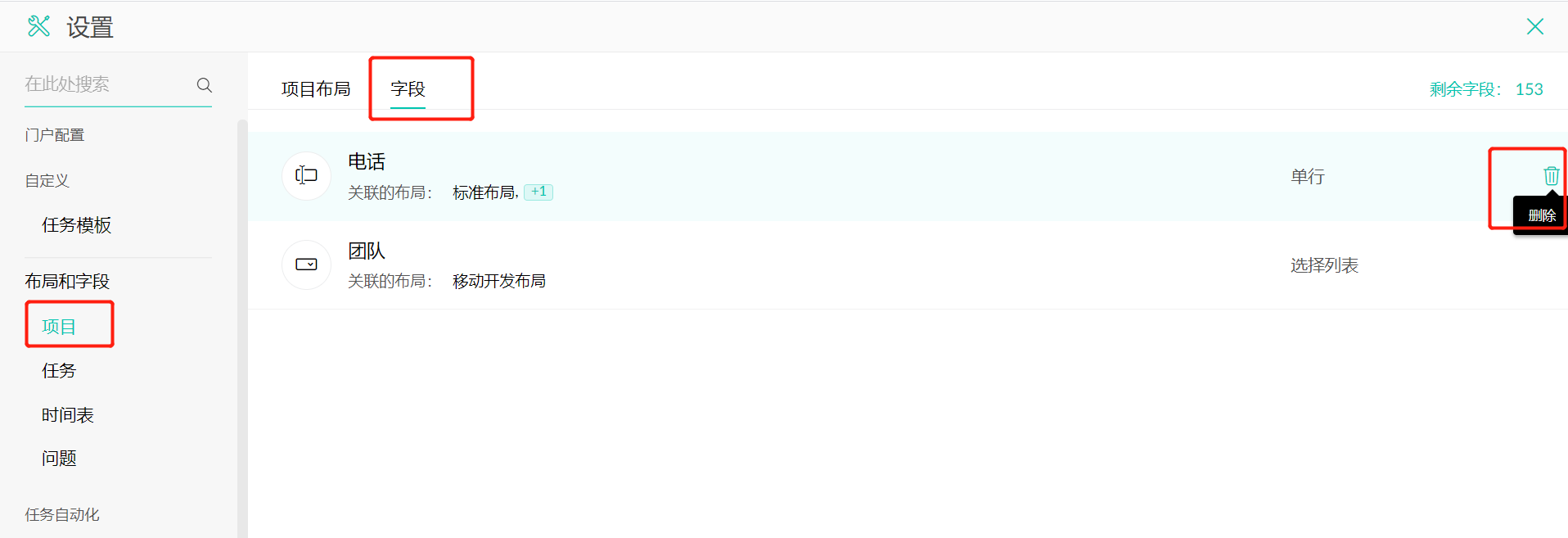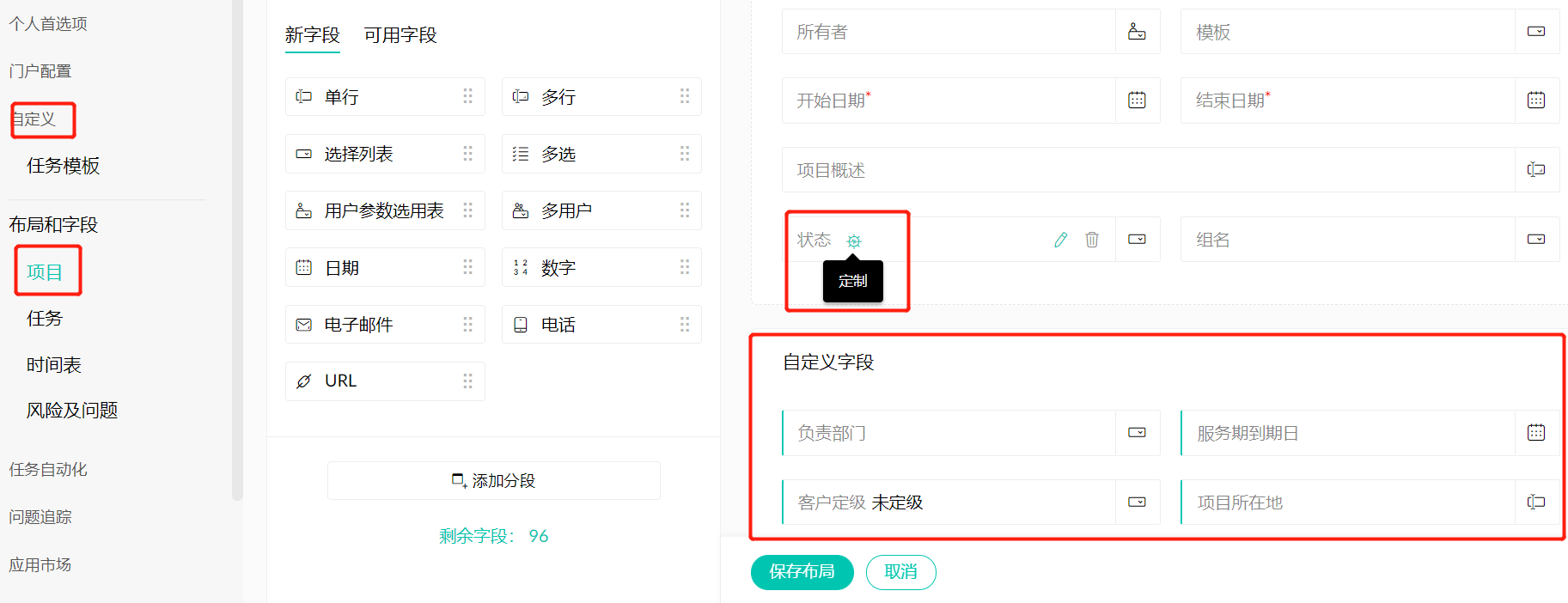 点击设置—自定义—布局和字段—项目,进行项目布局设置中。项目布局中可以添加项目需要的字段,我们在创建项目的时候就可以把这些项目信息输入进去。点击状态上的定制图标,可增加和修改项目的状态。