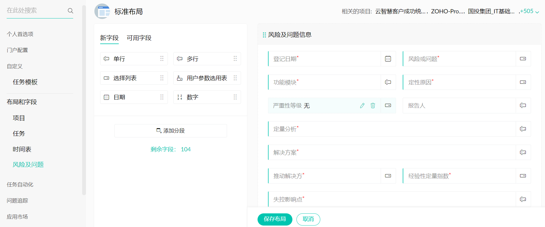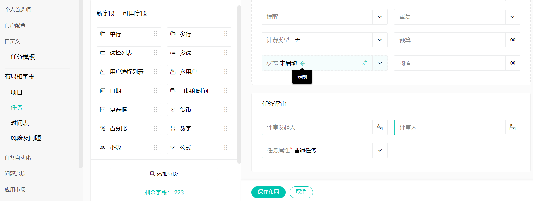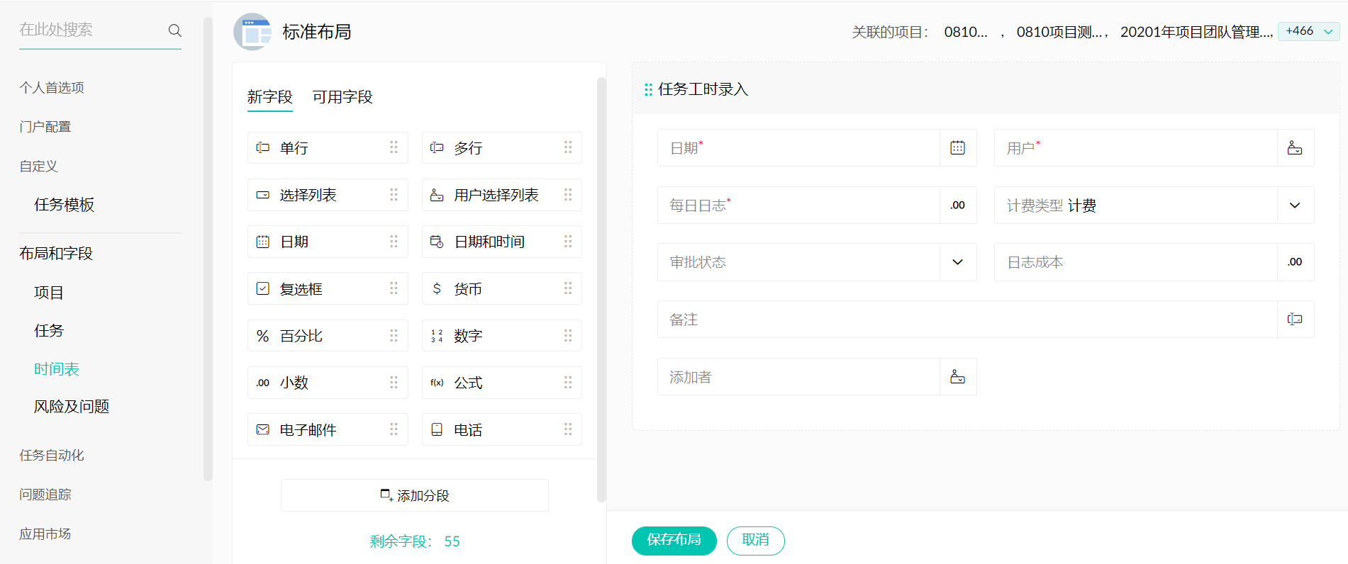 - 布局就是我们在创建项目,任务等时出现的表单中的内容。