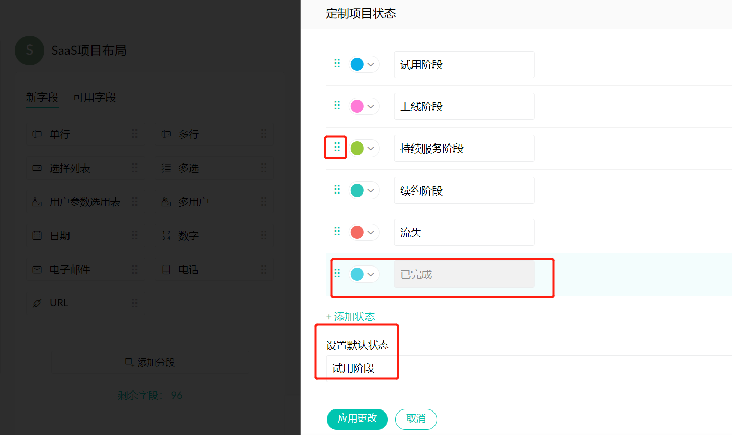 通过状态前的六个点可以拖动移动项目的状态的顺序。