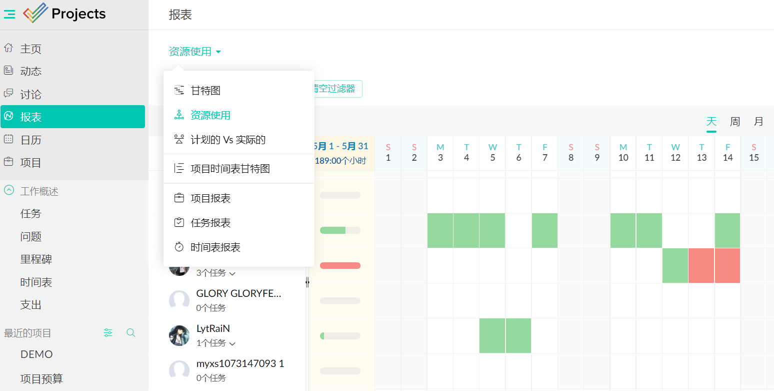 系统除了全局报表,在每个项目中还有每个项目的报表。项目内的报表可以统计当前的项目的任务,问题,工时还包括了资源使用报表,计划VS实际报表等。报表形式和全局报表类似,只是项目内的报表数据只有当前项目的数据。