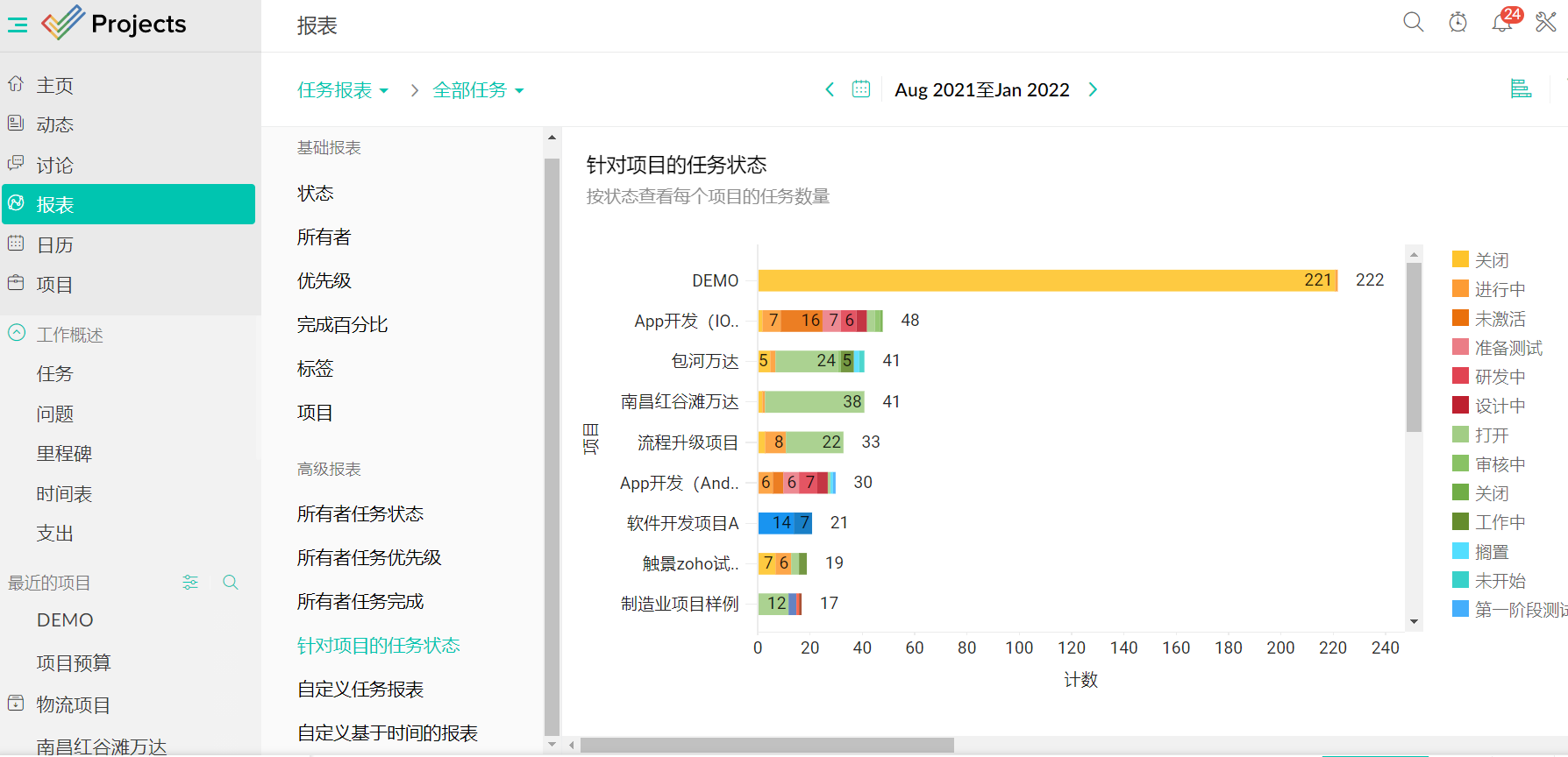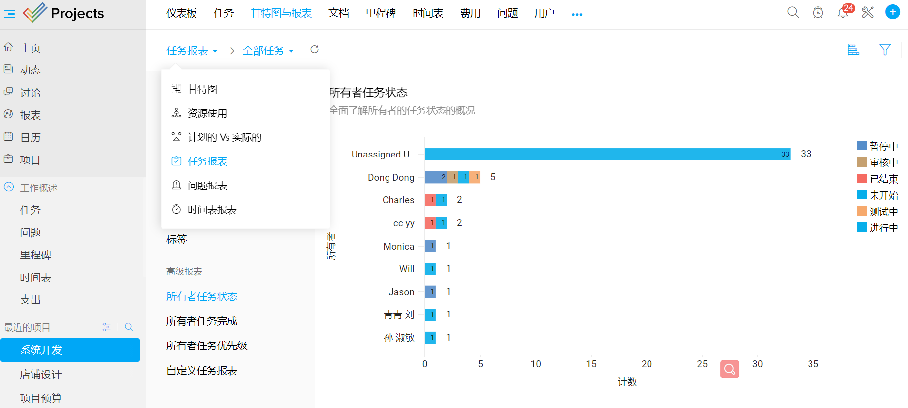 任务报表可以统计任务的各种信息,比如按项目统计每个状态的个数,按任务所有者统计每个状态的个数,统计每个优先级的任务个数等。