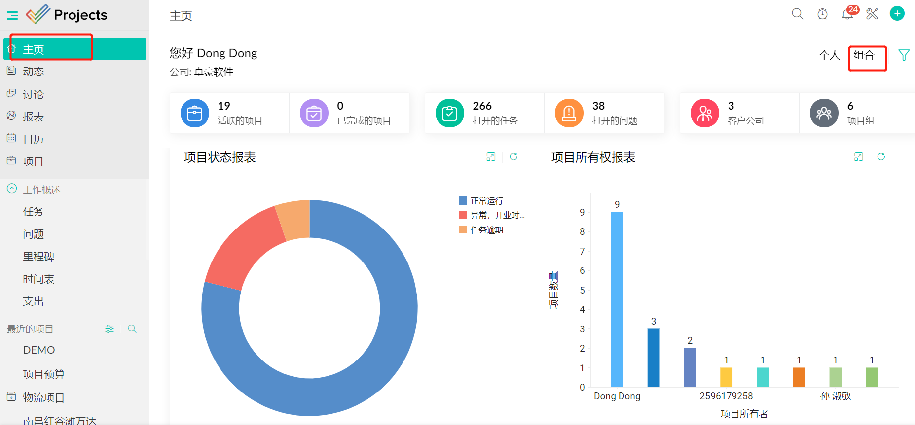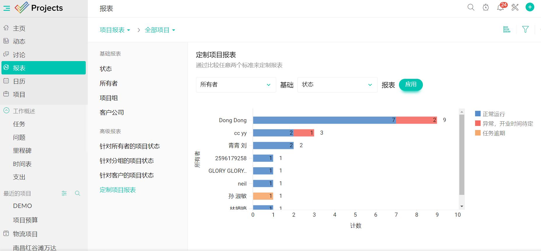 通过项目报表可以统计项目的状态,所有者等数据。用户可以查看每个PM拥有几个项目,每个状态的项目有多少等。
