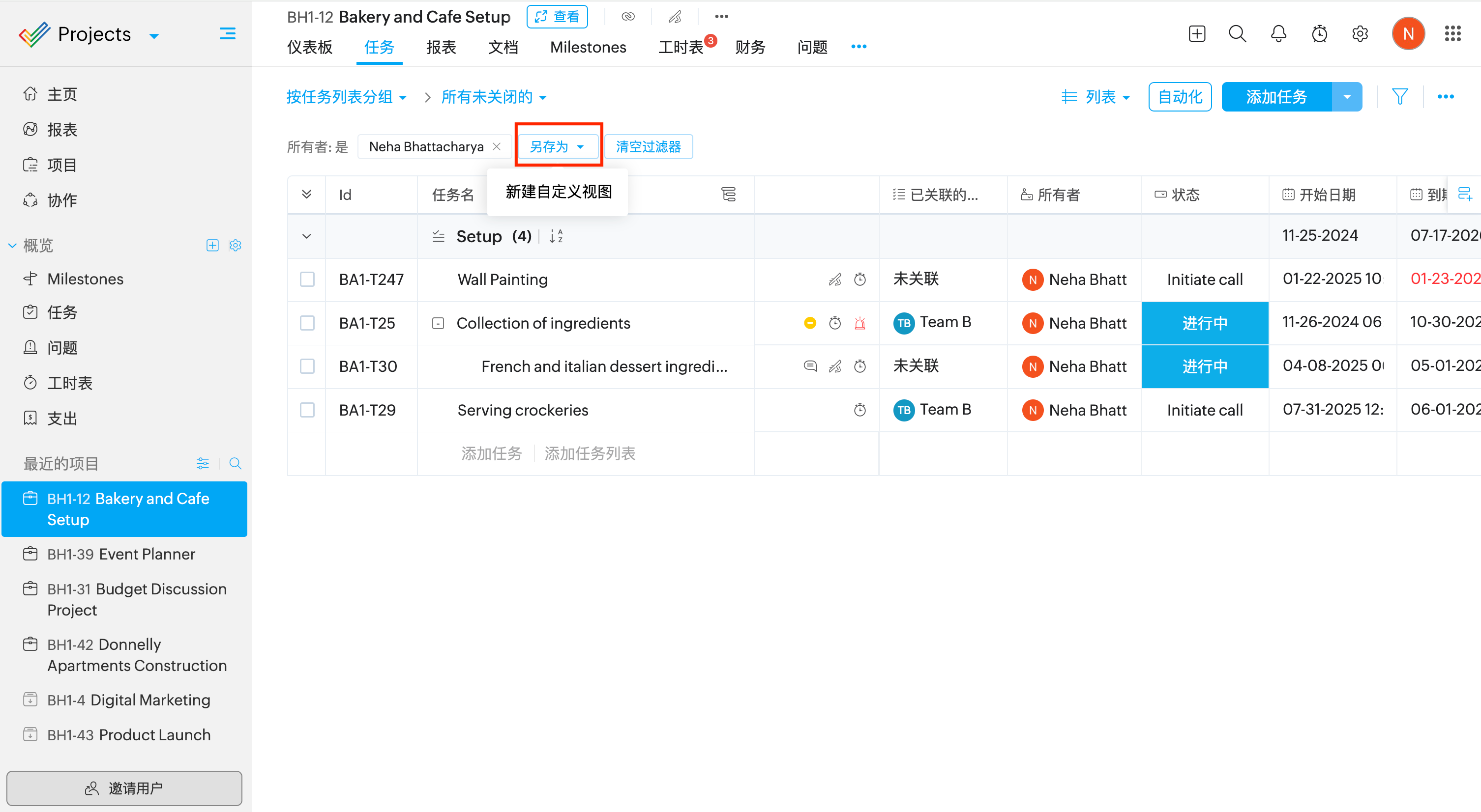 导航到项目并单击左侧导航窗格中的“任务”选项卡。