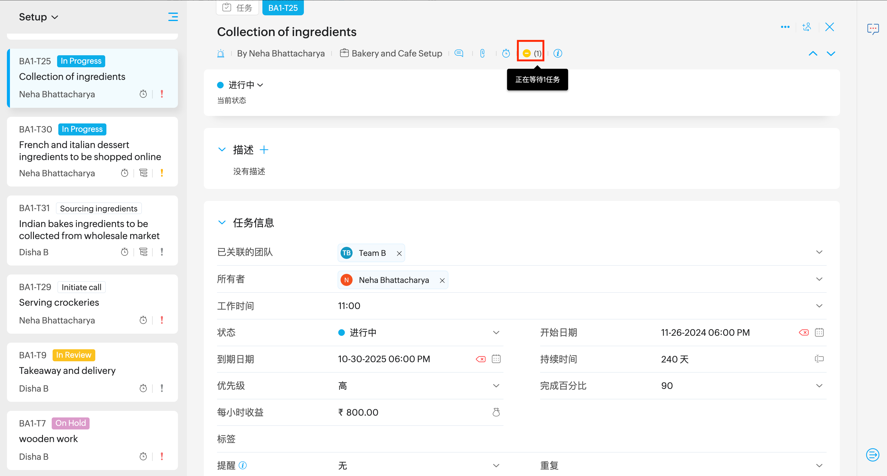 您可以在任务的列表、甘特图、看板视图中查看任务依赖状态。依赖状态也显示在任务详细信息页面中。